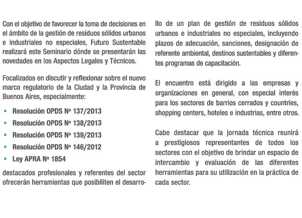 La gestión de los residuos urbanos constituye un desafío que debemos emprender. En este sentido consideramos importante acompañar el Seminario «Nueva Gestión de RSU e Industriales no Especiales» organizado por Futuro Sustentable en donde se tratarán las nuevas Resoluciones de OPDS y la Ley 1854 del Gobierno de la Ciudad, entre otros temas de gran relevancia ambiental.