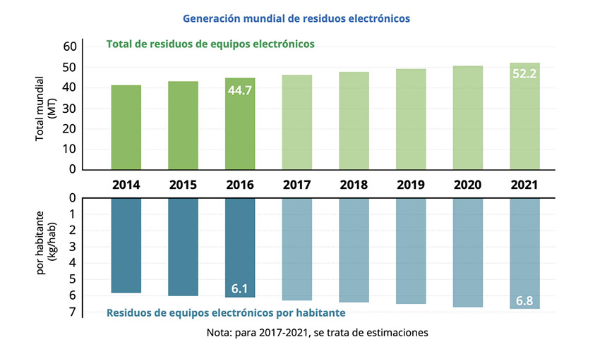 Generación mundial de residuos electrónicos. ITU. Observatorio mundial de los residuos electrónicos 2017.
