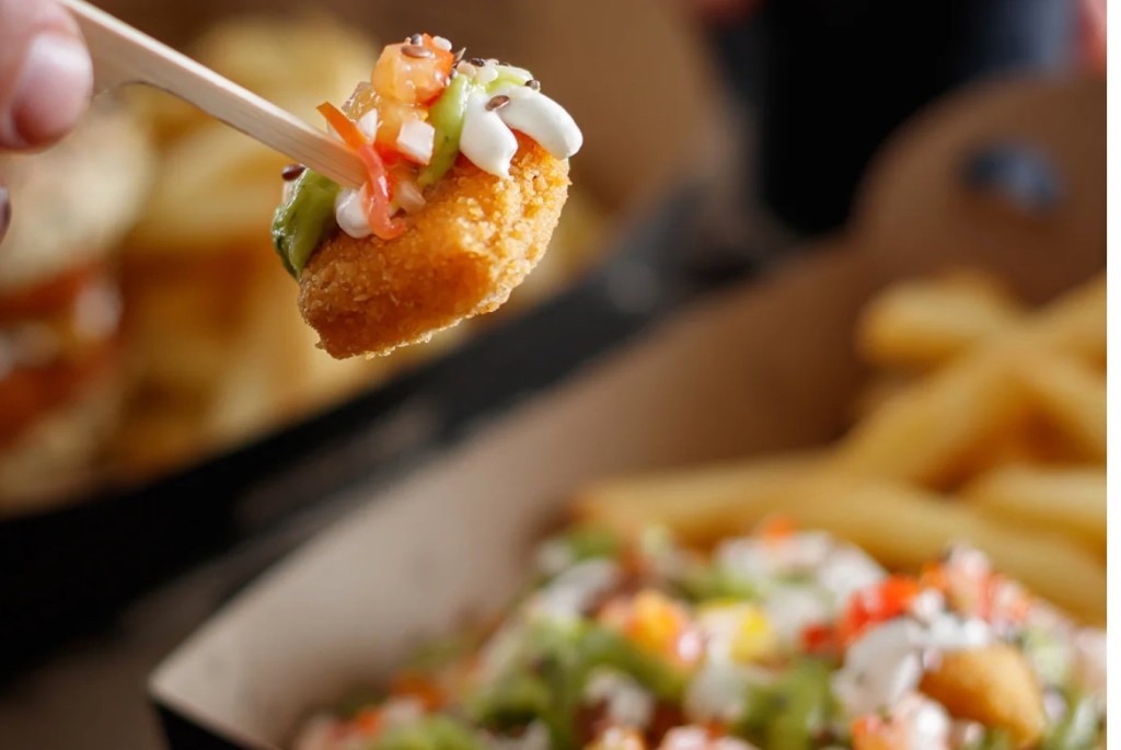 Venden pequeños cuadrados de milanesa que se comen con un palito de bamboo y así evitan los cubiertos de plástico